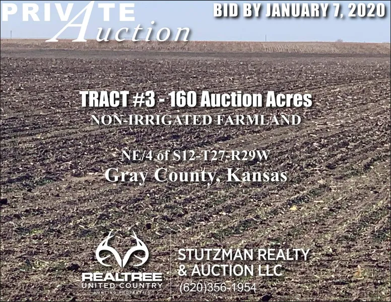 Tract #3 - 160 acre tract of non-irrigated farmland. Contact United Country Stutzman Realty & Auction / Realtree Hunting Properties in Ulysses, KS to inquire and bid on this 160+/- acre tract of non-irrigated farmland with non-producing mineral rights.