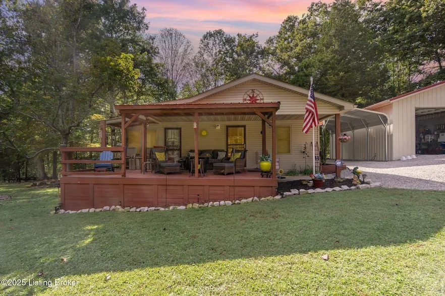 Discover lakeside living at 33 Elmwood Dr in Clarkson, KY. This fully furnished 2 bed, 1 bath home sits on 1.7 shaded acres and is designed for lake enjoyment, privacy, and flexibility. Inside, the cozy layout is anchored by a large sunroom, perfect for year-round enjoyment and versatile enough to serve as extra living or guest space. Outdoors, you'll love the dock in a no-wake zone with COE approved transfer, giving you calm-water access for swimming, fishing, and kayaking. A short golf cart ride leads directly to the boat ramp, making lake access simple and convenient. Adding more value, the property includes a large detached pole barn with a fully customizable loft and overhead storage, ideal for hobbies, boat/equipment storage, or future guest space. With mature shade trees, Cont. turn-key furnishings, and could potentially be used for Airbnb, this home is ready for its next chapter. At 33 Elmwood Dr, you'll enjoy a rare blend of acreage, convenience, and lake lifestyle. This home is being offered turn-key with most furniture included, making it ready to enjoy from day one. Please note that personal memorabilia and certain items in the garage do not convey with the property. Some items may be available for separate purchase or negotiation. Please check with your agent for details. Dock transfer with COE approval