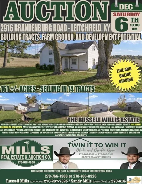 WHETHER YOU’RE A FARMER LOOKING TO EXPAND, A BUILDER EXPLORING DEVELOPMENT POTENTIAL OR SOMEONE DREAMING OF YOUR OWN HOME PLACE, THIS IS YOUR OPPORTUNITY. WITH 161 +/- ACRES OFFERED IN 14 TRACTS, JUST MINUTES FROM WESTERN KENTUCKY PARKWAY AND INSIDE THE LITCHFIELD CITY LIMITS, THIS FARM DELIVERS CONVENIENCE, PRIVACY AND EXCEPTIONAL POTENTIAL. PROPERTIES LIKE THIS RARELY COME TO AUCTION - FARMS OF THIS QUALITY AND LOCATION ONLY BECOME AVAILABLE A FEW TIMES IN A LIFETIME. BID LIVE ON-SITE OR ONLINE - BUY ONE TRACT, MULTIPLE, OR THE ENTIRE FARM.