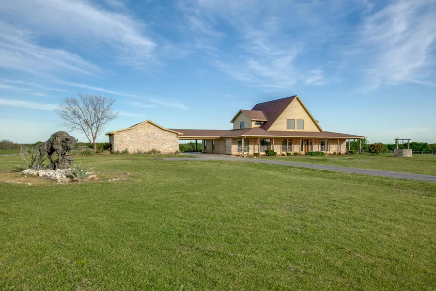 This custom built 3,037 sf residence is ideal for year-round living. Sitting east to west, on the highest hilltop in the area, the home was angled so that there is always a cool breeze blowing across the front and back porches. These deep porches, which run the entire length of the house, provide plenty of room for rocking chairs from which to enjoy a beautiful full view of an early morning sunrise or a late afternoon sunset that North Texas is known for. The house sits back from the road behind a beautiful gated entrance on an all-weather road. There are floor-to-ceiling windows throughout the first floor, allowing an abundance of light to fill the home and from which to enjoy the scenic views of the pastures and adjacent ponds. The open floor plan features a spacious living room with built-in bookshelves, a vaulted ceiling, and woodburning fireplace. A well-laid out kitchen is situated between the formal dining room, breakfast room, and utility/mud room with plenty of built-in cabinets for storage. Off the breakfast room is an office that could be converted to a sunroom. The downstairs master bedroom has a large bathroom with dual sinks and vanities, a jetted tub, and separate shower. An adjacent bedroom could be used as a sitting room or a guest room. French doors open from the master bedroom out to the back porch. Upstairs are two guest room suites. A porte-cochere connects the oversized two-car garage with the house. The area around the house is watered by an underground irrigation system that includes the garden and mature fruit trees.