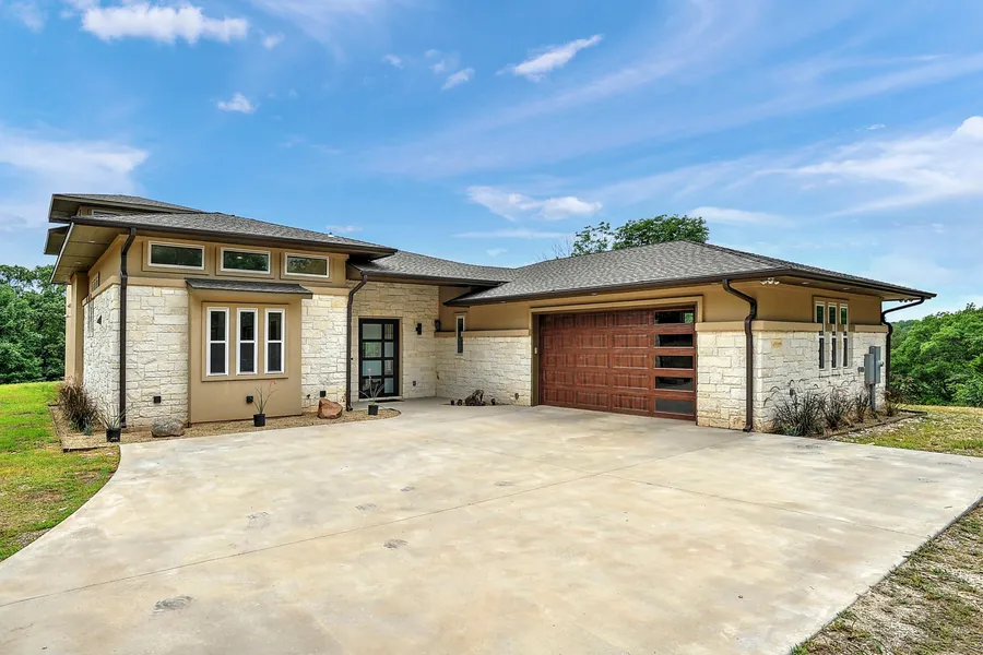 This Hill Country Modern home designed by Janet Hobbs of Hobbs Ink, LLC features soaring ceilings and expansive windows that create an open and airy atmosphere. The great room and kitchen overlook a large outdoor living area with a gas log fireplace and expansive views of the hillside and tree lined meadow below with breathtaking sunset views. Attention to detail is seen throughout the home with touches like a waterfall granite kitchen island and high end contemporary front entry door. This home lives large with four bedrooms, four full baths, an office area, dog room and oversized garage. Boasting just under forty acres of mostly heavily wooded land, this property is private north Texas hill country gem!