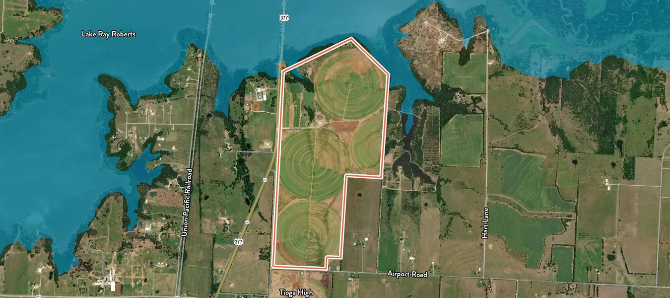 The Property is located on the southeast corner of Highway 377 where it intersects with Lake Ray Roberts in Tioga, Grayson County, Texas. It is one-half mile north of the newly constructed $25M Tioga High School, and directly north of the City Center of Tioga. While currently an operating grass farm this property includes frontage along Highway 377 and beautiful waterfront views of Lake Ray Roberts making this property truly one of a kind.