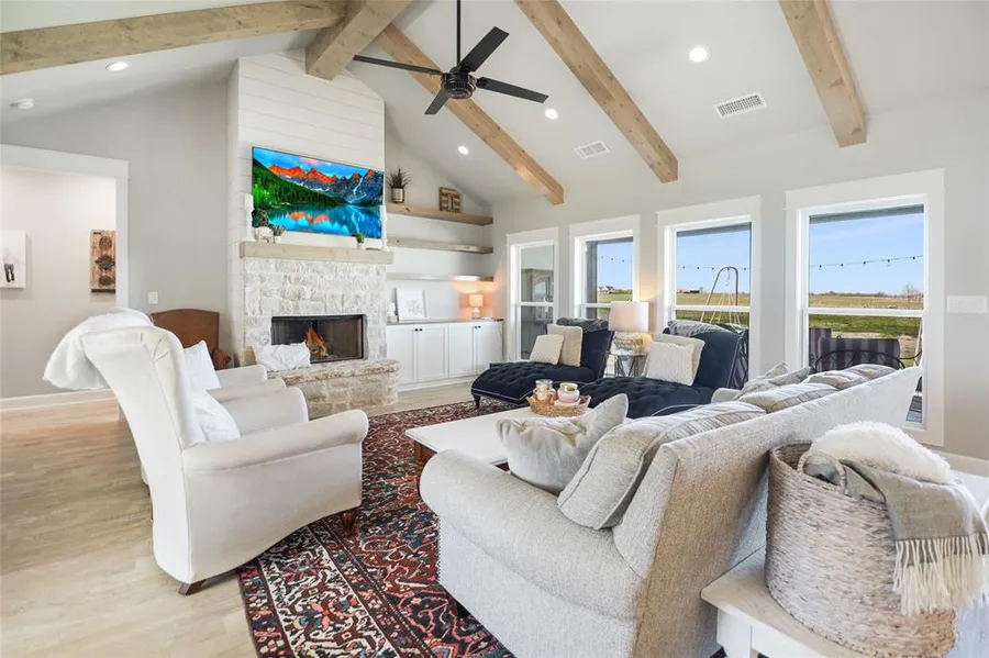 Offer DEADLINE Sunday 4-11 7pm. Absolutely STUNNING 1 year old Modern Country Farmhouse on over 1 acre. Cute as can be! Huge lot which provides you great space both behind the house and in front. Watch the sunset from this country setting outside the city, then go inside and enjoy a modern newly built home. The wood floors, fixtures, kitchen finish, living room with wood beams on the ceiling and a stone fireplace all only begin to describe the beauty inside this home. There are 4 bedrooms but one is near the front entry makes a perfect home office space with a view out the large front windows. Relax on the back patio or on the front porch swing. Let the troubles of the day slip away.
