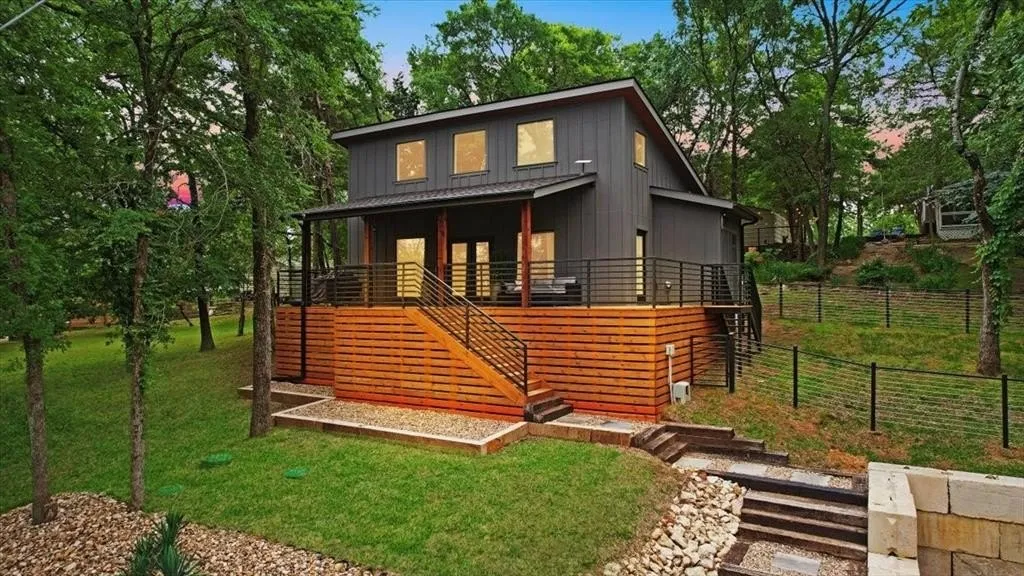 Sellers are highly motivated and will consider all offers! Make your escape to this stunning, fully custom, modern hillside paradise in the highly sought after Cambridge Shores on Lake Texoma! If you are looking for a home on one of the most desired lakes in North Texas, look no further! Surrounded by trees you'll find a tranquil escape in a peaceful wooded setting, just minutes from the community boat ramp. Beautifully landscaped grounds welcome you onto the expansive wrap around deck, adorned with cedar posts, and custom steel railing that carries into the yard, with plenty of room for family and friends to be entertained. The front entry welcomes you into a gorgeous open living space where you'll find no detail unattended. Soaring vaulted ceilings finished in tongue and groove pine add the perfect amount of warmth to this modern lake home! Picture windows surround the space for optimum natural lighting, luxury vinyl plank flooring throughout for maximum durability, while living your best lake life! As you enter the kitchen, you'll find stunning high end, white oak, soft close cabinetry, sleek white quartz countertops, and stainless steel appliances to perfect this entertainers dream! A first floor master with ensuite featuring a walk in shower offers ease, comfort and convenience, along with private deck access that allows you to stay in your robe to enjoy your morning coffee. A few bonus features offered are a whole house water filtration system, Delta Kitchen and bath finishes, recessed lighting, blown in insulation for increased energy efficiency, and spacious closets. Don't miss this opportunity to make this gorgeous lakehouse yours! This is the perfect option for your weekend getaways, a lucrative VRBO, or full time lake living! Call or text for a private showing, or reach out to your favorite Realtor today!