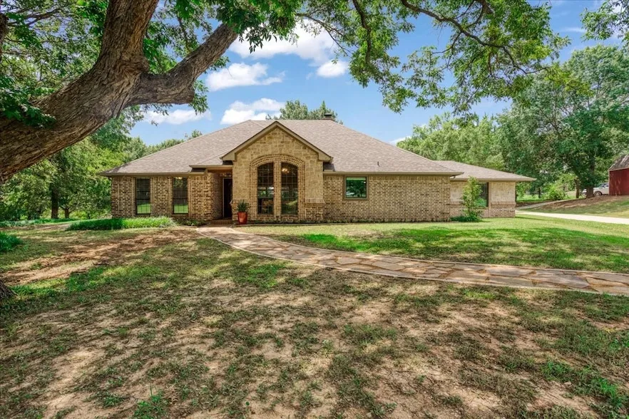 Welcome to your own private escape on 2 acres on the outskirts of west Sherman. Tucked away on a private road nestled among the trees, this home sits in the perfect country-like setting while still being inside city limits and conveniently located near FM 1417, highway 82, Sherman High School, and Pecan Grove Park. Approaching the property, you will drive through a wrought-iron private gate at the front of the long driveway that leads to this charming brick home, with a stone path leading you to the front door. Stepping inside you are greeted by plenty of natural light and large windows, tall ceilings, crown molding, and rounded archways in the main living areas. The spacious open floor plan centers around a stone wood-burning fireplace with decorative mantle and raised hearth. The bright open kitchen is perfect for a chef who loves to entertain, featuring plenty of counter space, cabinets for storage, built-in open shelving, granite countertops, stainless steel appliances, and centered kitchen island. The bedrooms feature recessed ceilings and home includes three full bathrooms. The primary bedroom hosts an ensuite bathroom with separate shower, large tub, and dual sinks. Step out to the backyard and escape to the expansive patio and in-ground pool, a cool reprieve from the Texas summer heat! The large backyard is home to several large mature oak trees, while also leaving plenty of space to run and enjoy the outdoors. The additional red barn storage shed is convenient for outdoor tools and equipment. Just a short walk will take you to Sherman's Pecan Grove Park & Athletic Complex. Sherman ISD has recently re-zoned this area to be included in the new Parker Elementary School zone. Don't miss your opportunity own a 2-acre slice of country living in west Sherman! Call your favorite Realtor and schedule your viewing today - must see in person to appreciate!