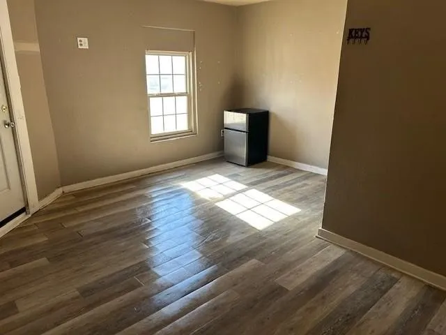 The layout provides flexibility for living and dining arrangements, while the bathroom includes a shower. A rustic accent wall adds character and warmth to the space. This property is ideal for tenants seeking a straightforward, low-maintenance home.