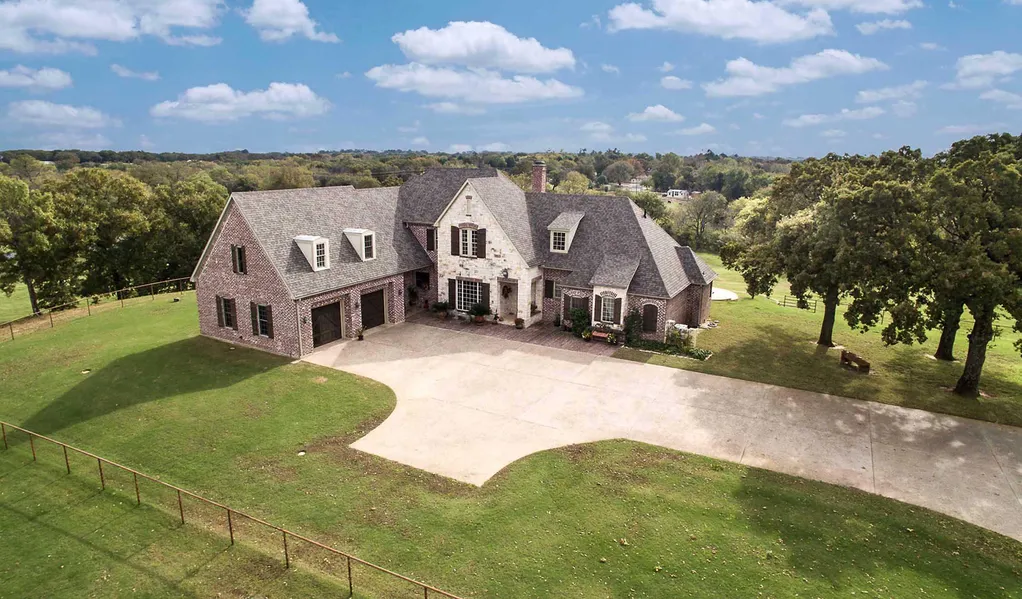 This eye-catching 11-acre estate offers a striking brick & stone custom home and in-ground pool in an elevated setting with scattered oak trees overlooking a scenic fenced pasture.