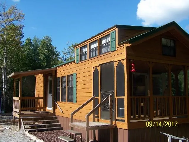 Cute and cozy for your weekend get-a-way. Park model home sitting on 5 acres in a very private location. Like new park model that is framed with 2 x 4s and wrapped with Tyvek for insulation, then covered with the same metal that on the roof. This owner has really paid attention to every little detail. When you hear someone say Pride of Ownership, this is what they must mean. Inside youll find a kitchen/living/dining combo, master bedroom with closet storage and bathroom with a full sized shower. Also has an upstairs loft perfect for a second sleeping area. Vaulted wood ceiling, heat and a/c, full size appliances, including a 20 cubic ft refrigerator and a 30 range. Cedar cabinets and laminate floors. There is a hookup for a stackable w/d and an electric fireplace to make it even cozier. The screened-in-porch is an added bonus.