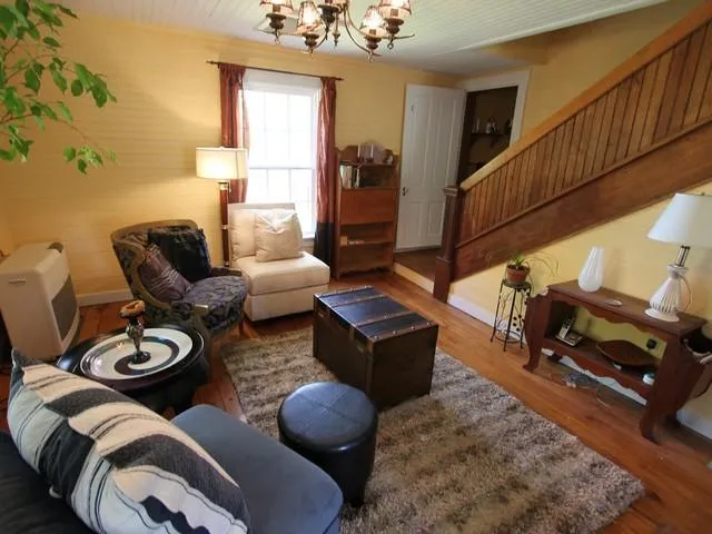 The log portion of this exceptional historic home dates back to ca 1810, frame addition dates to ca 1910, which includes original hardwood floors, beautiful interior logs, and more recent unique lighting, trim, and handcrafted cabinets. The current owner has lovingly updated with all new windows, new lining for living room chimney serving wood stove, new propane logs in kitchen, new hot water heater, in master bedroom new hard wood floors, closet, shelving, and walk-in storage, new shingle roof over kitchen section, replacement/painting of some external trim and wood siding, some new interior paint, and some driveway widening with new culvert. A brick patio off of one of two covered porches accesses stone steps and walkway to gorgeous wildflower gardens, creek, and yard leading to garden shed, fruit trees, and grape arbor. Artistic touches abound. Out buildings include an artist studio, barn, and loads of storage space. Gas monitor for extra warmth in living room.