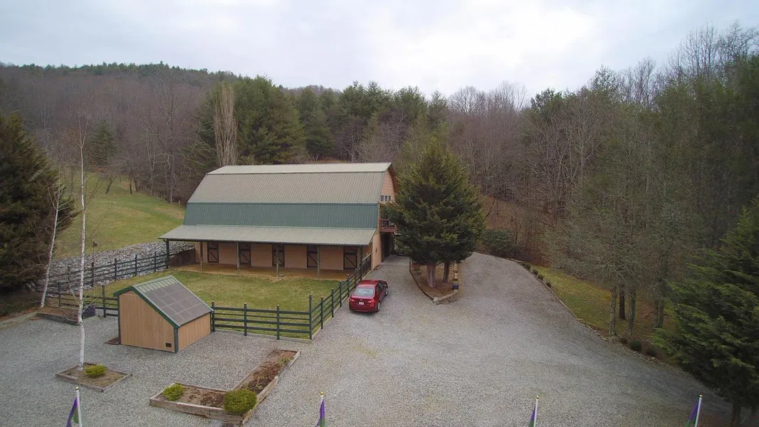 Blue Ridge Mountain Mini-Farm. This 3 bedroom 2 bath, 3100 square foot home is located in a secluded little valley in Mouth of Wilson Virginia. Just minutes to the New River and in very close proximity to Grayson Highlands Park, Jefferson National Forest, the Virginia Creeper Trail and the Appalachian Trail. The property offers approximately 25 acres of mature woods with extensive trails, picnic areas and approximately 10 acres of open pasture. This property is very private, protected and peaceful. The home is really special as well. There is a 6 stall barn downstairs with clinic/tack room and full bathroom. There is a lovely, large screened-in porch perfect for listening to the beautiful little branch that runs right beside it. Upstairs is a huge open living area with nice built-in bookshelves and large gas log fireplace. A very nice master suite with large walk-in closet and guest room are also located upstairs. There is also a nice open deck upstairs with views of the surrounding mountains. This would be a perfect property for any type of livestock, could make an excellent small farm, animal rescue or dog breeding facility. Excellent for a weekend getaway or a full time residence.