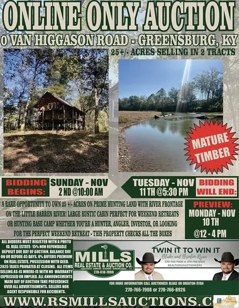 A RARE OPPORTUNITY TO OWN 25 +/- ACRES ON PRIME HUNTING LAND WITH RIVER FRONTAGE ON THE LITTLE BARREN RIVER! LARGE RUSTIC CABIN PERFECT FOR WEEKEND RETREATS OR HUNTING BASE CAMP WHETHER YOU’RE A HUNTER, ANGLER, INVESTOR, OR LOOKING FOR THE PERFECT WEEKEND RETREAT - THIS PROPERTY CHECKS ALL THE BOXES GREAT FOR FISHING, KAYAKING AND WATER ACCESS - LARGE CABIN - EXCELLENT HABITAT FOR WHITE TAIL DEER, TURKEY, AND SMALL GAME - CLEARED TRAILS IDEAL FOR ATV RIDING AND EASY ACCESS - MULTIPLE SITES FOR FOOD PLOTS - QUIET, PRIVATE LOCATION WITH ENDLESS RECREATIONAL POTENTIAL