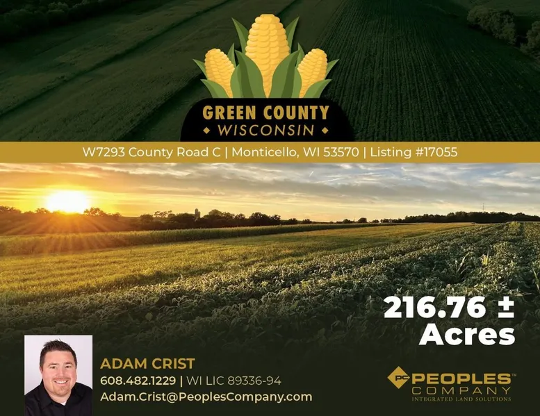 Peoples Company is honored to introduce this exceptional opportunity to own 216.76 acres of highly sought-after Green County farmland. You'll find this masterpiece in the heart of Green County just 50 minutes south of Madison, and a short 16 minutes north of Monroe, Wisconsin.