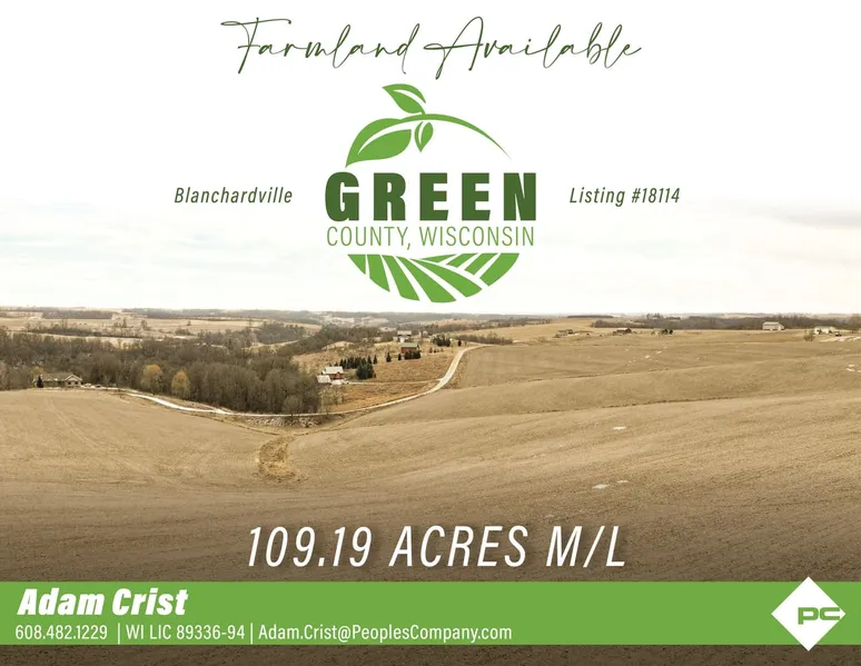 Peoples Company is thrilled to present an exceptional opportunity to acquire 109.19 m/l acres of highly productive and versatile farmland in the heart of Green County, Wisconsin. Situated just a few minutes from the charming town of Blanchardville, this property boasts 93.29 FSA cropland acres with an impressive Productivity Index (PI) of 59.8, making it an ideal choice for those looking to expand their agricultural endeavors. The primary soil types of Newglarus and Palsgrove silt loam ensure optimal growing conditions for a wide variety of crops.
