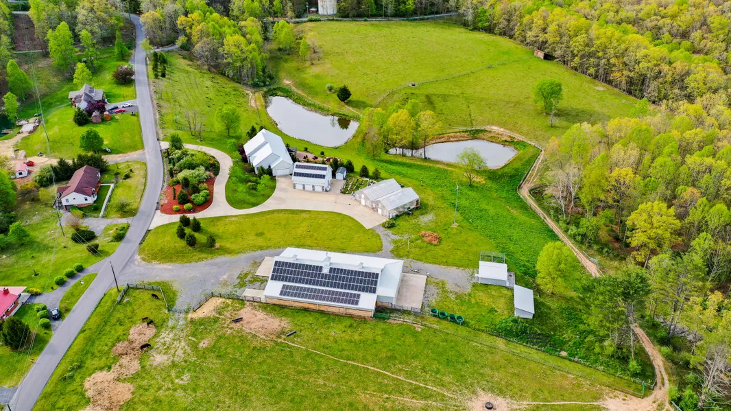 The surrounding 41-acre turnkey farm includes three grazing pastures, two stocked ponds, a climate-controlled barn with 6 roll-up bay doors, a greenhouse with raised beds and automatic vents, and a chicken house.