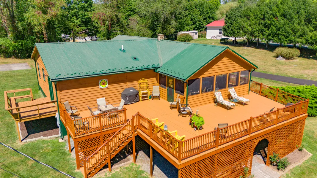 Serenity on Elm - Attractive one-level cedar-sided home near downtown. 3-bedrooms, 4-baths, spacious screened porch and deck, large landscaped yard with two outbuildings. Originally constructed in 1950 and remodeled in 1989 and 2005, this comfortable home has a rustic-style exterior with a contemporary interior. Features include new flooring throughout, three roomy bedroom suites, a large porch and deck for relaxing and entertaining, and a nearly 1.2+/- acre yard. It enjoys a surprisingly private location near Lowes and the Gateway shopping complex.