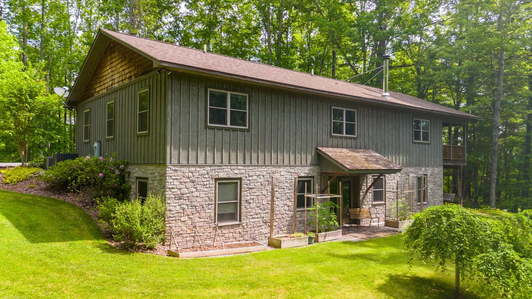 Located in the rolling farmland west of Lewisburg, the property is an easy 15-minute drive from shopping and services, and enjoys ready access to I-64. A winding gravel lane leads through a small pasture into the woods, and climbs to the home, which is sided with attractive pine sheeting with hemlock battens, wood shingles and stone veneer. In addition to its attached double garage, there's plenty of parking space for multiple vehicles.