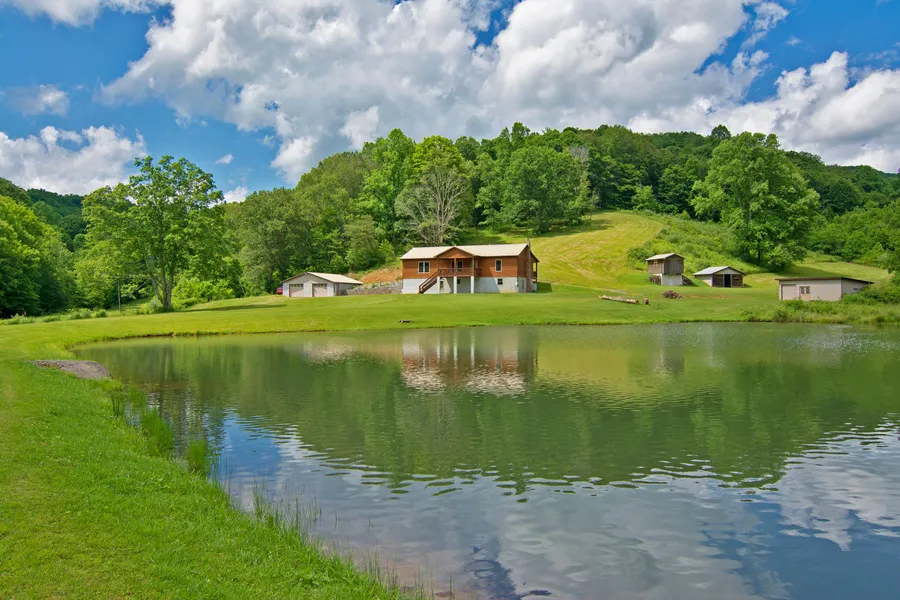 Have your own slice of almost heaven West Virginia with this mountaintop farm. On a peaceful 48+ acres, home features pond, wildlife, and covered front porch over looking the large pond and open meadows. The cedar-siding home offers a full basement, partially finished with wormy chestnut from original early 1900s farm. Four outdoor buildings including a cellar, a woodshed, a tractor garage with workshop, and a 2 car detached garage complete with wiring for portable generator to home. A hunter's dream with lots of wildlife. Property offers 10-12 acres of open acreage with remainder wooded, fenced garden area, and floating dock to make this a move-in ready property.