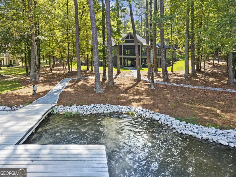 Stunning Lakefront Luxury Home in Reynolds Landing with Sunset Views! This brand-new construction lakefront home offers the perfect blend of luxury and comfort, ready for its new owners to create unforgettable memories. Nestled in the desirable Reynolds Landing community, you'll enjoy panoramic sunset views over the serene waters. Step inside to discover vaulted ceilings that enhance the spacious open floor plan. The gourmet kitchen features a large island, ideal for culinary enthusiasts and entertaining guests. Enjoy seamless indoor-outdoor living as you gather with family and friends on the expansive deck, overlooking your lush, level backyard. Retreat to the main-level master suite, designed for tranquility and privacy. An additional guest bedroom above the garage with its own full bath provides a perfect space for visitors. The downstairs area is an entertainer's dream, showcasing a wet bar and ample entertainment space, along with three more guest bedrooms and plenty of storage for all your lake toys. Set on over an acre of land, this property includes a brand-new max dock for your boating adventures and offers the option to add a pool for those sunny days. Experience the ultimate lakefront lifestyle in this exceptional home where luxury meets leisure. Seller is making golf membership availableDon't miss out on this incredible opportunity! Schedule your private tour today!