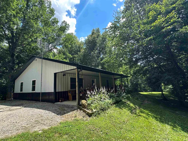 Welcome to your private haven! Travel down the picturesque gravel lane to this charming pole barn-style ranch home, nestled amidst serene woods. Built in 2018, this 1,200-square-foot residence offers a perfect blend of modern comfort and rustic charm. The covered front porch welcomes you into an open-concept living, dining, and kitchen area with vaulted ceilings, creating an airy and expansive feel. Enjoy the warmth and character of natural wood finishes throughout the walls and ceilings, paired with sealed concrete floors that exude rustic cabin. The kitchen boasts Hickory cabinets, stainless steel appliances, including a large apron sink, and an island that accommodates the range and provides additional seating, perfect for casual meals and entertaining. This home features two bedrooms with ample closet space and one full bathroom with a large walk-in shower. There is also a designated...