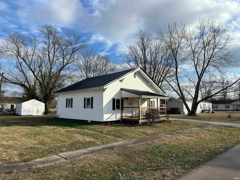 Nestled on a quiet street in Jasonville, this charming 2-bedroom, 1-bath home has been beautifully updated and is move-in ready. With over 1,000 square feet, the open concept living, dining, and kitchen areas with tall ceilings feel spacious and inviting, full of an abundance of natural light. Improvements in the last 3 years include new windows, doors, metal roof, flooring, fixtures, and fresh paint throughout. The kitchen boasts ample counter space and plenty of oak cabinetry for all your culinary needs. Designated laundry space including a new LG stackable washer and dryer stay with the home. Whether you are enjoying the sunset from the front porch or stepping out of the sliding glass doors to the covered back porch enjoy a generous yard in a quiet neighborhood. A 12x14 outbuilding provides extra storage and park your vehicle out of the weather in the newly installed carport. Additional upgrades such as a new HVAC system with a transferable warranty, update bathroom vanity, porch railings and custom blinds add to the home's appeal. Move in condition, low property taxes and affordable utilities makes it easy to enjoy homeownership!