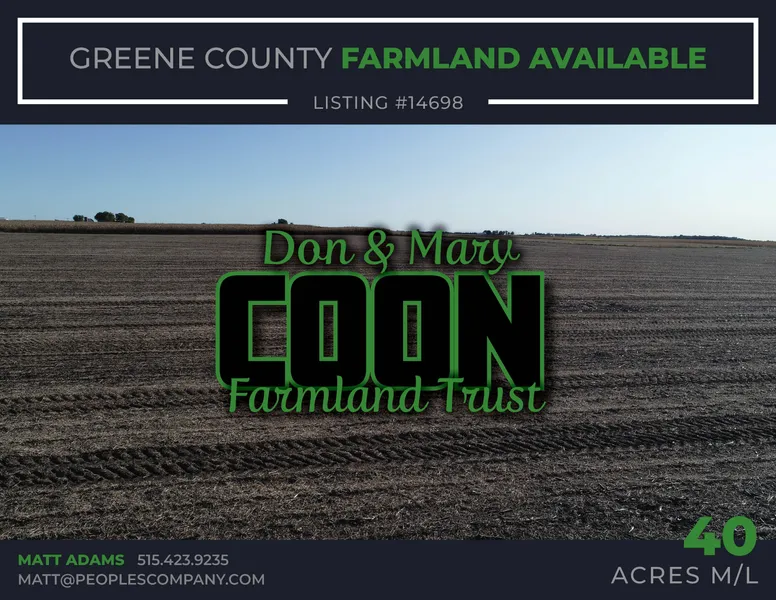 Peoples Company is pleased to exclusively represent the trustee and beneficiaries of the Don & Mary Coon Farmland Trust in selling three farmland tracts in Greene County.This farm land tract consists of 40 acres m/l with approximately 38.56 FSA tillable acres with a weighted CSR2 value of 87.3.Primary soil types include highly productive Canisteoclay loam, Nicollet loam, and Webster clay loam.The current farm lease has been terminated and the farming rights are available for the upcoming 2020 season.