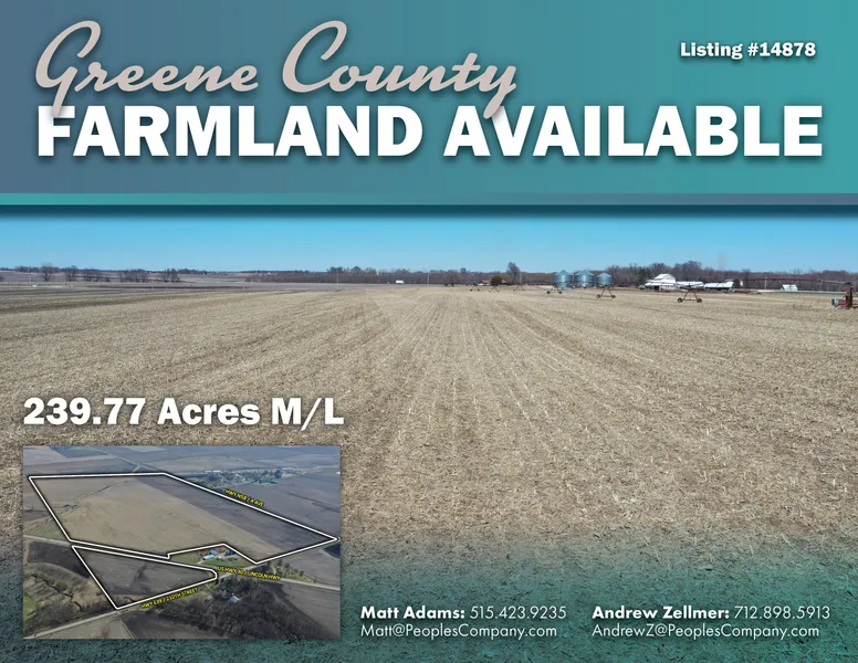 Opportunity to own high quality farmland along the Greene/Carroll County line. This 239.77 Acre M/L property offers 218.14 current FSA Tillable Acres carrying a CSR2 of 76. This farm features Nicollet Loam with a CSR2 of 91 as its predominant soil type. The farm is located less than a mile from the Ralston Landus Cooperative and has a strong yield history making this an excellent investment farm or add-on piece to an existing farming operation. The farmland is located on the eastern edge of Ralston, Iowa in Section 31 of Kendrick Township, Greene County, Iowa.