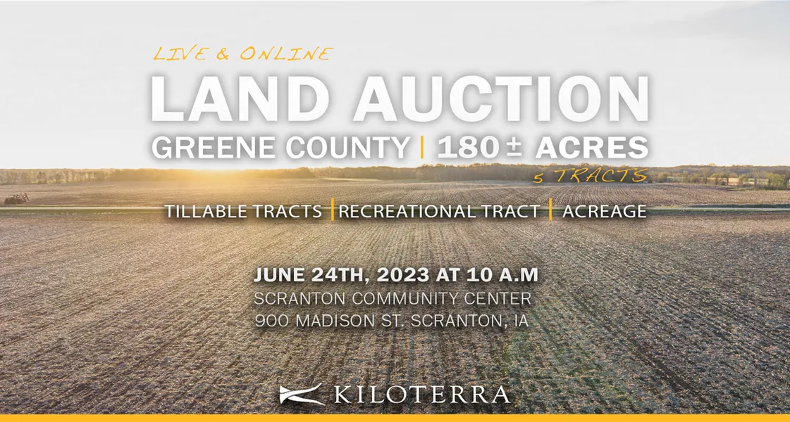 Auction Method: All tracts will be sold via the Live Public and Simultaneous Online Auction on June 24th, 2023, 10 AM, at the Scranton Community Center, 900 Madison St, Scranton, IA 51462.
