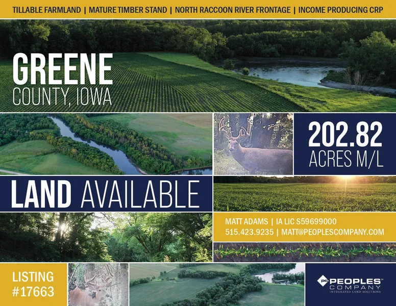Peoples Company is pleased to present this impressive 202.82-acre m/l property located 4 miles southeast of Jefferson, Iowa in the heart of Greene County. Etched out by the natural flow of the North Raccoon River, this property features recreational opportunities, income-producing cropland, CRP acres, and access to the river. Evidence of a strong deer population is present, and the combined timber and CRP acres make this an ideal habitat for other wildlife species including turkeys, ducks, and pheasants. It will be offered as two individual tracts, each with varying opportunities, making it an excellent investment for the buyer looking to diversify their portfolio, or for any outdoor enthusiast looking for a unique recreational property to make their own.