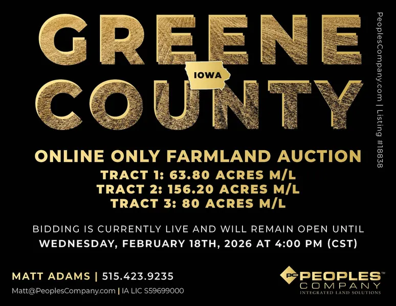 Greene County, Iowa Online Only Farmland Auction - Wednesday February 18th, 2026! Peoples Company is pleased to be representing the Rowles Family in the sale their family's 300 acres m/l. Offered as three individual tracts, these farms are located northwest and southwest of Grand Junction, Iowa in Sections 7, 20, and 29 of Junction Township, Greene County, Iowa. Tract sizes range from 63.80 acres to 156.20 acres and would make for great add-on tracts to an existing farming operation or an investment for the Buyer looking to diversify their portfolio or hedge inflation.