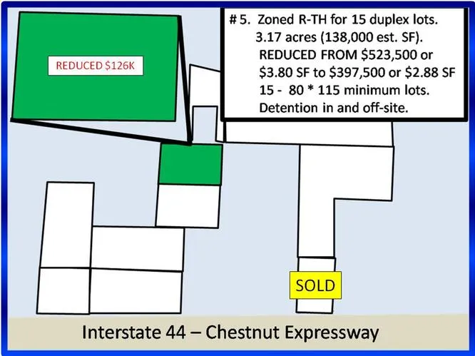 This offering is for Tract # 5. 3905 West Chestnut Expressway. It is zoned Residential Townhouse District (R-TH) for 15 duplex lots. It spans 3.17 acres (138,000 est. SF) with a minimum of fifteen 80 * 115 lots. Detention in on-site and off-site. Significantly REDUCED $130K+ to $397,500 ($3.80 SF).