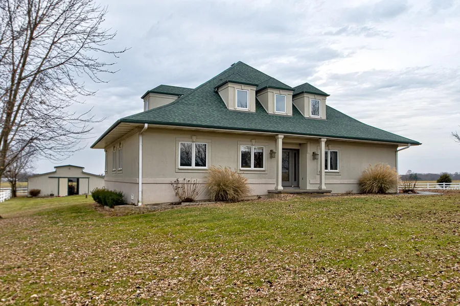 Awesome 2 story 4 BR, 3 BA home w/3 living areas & 3 car gar, situated in a convenient country setting on 28 acres w/a pear tree lined lane & vinyl fenced yard & paddocks. You'll love the huge family room w/20' floor to ceiling glass wall w/south exposure & stacked stone gas fireplace. Adjacent enjoy a chefs kitchen w/all stainless appliances including dual ovens, gas range, warming drawer, recessed commercial refrigerator/freezer, & lots of cabinets to host lg family events. Kitchen dining opens to family room & living dining room is large & exits to a covered & open patio. The main floor master offers a nice dual vanity bath, jetted tub & walk in shower & large walk in closet. 2 additional bedrooms are located downstairs with w/bath offering walk in shower. Upstairs is another huge bedroom & bath with dual vanities, jetted tub & shower. Upstairs also is a large bonus room that has been used as a recreation room & study. Additional features are a wet bar, central vac (including garage), Zoned HVAC's + outdoor wood furnace. Outdoor furnace pumps hot water through the central forced air system and will heat the whole house when economical wood heat is desired.
