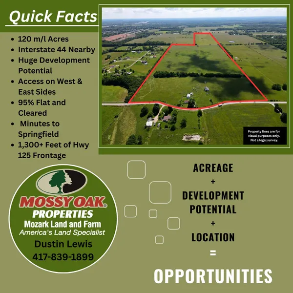Prime location with unparalleled accessibility, this expansive 120-acre property offers vast opportunities for large-scale developments. With entrances conveniently situated on two different roads, the land is designed to accommodate diverse projects. This property has over 1,300' of Highway 125 frontage enhancing visibility and convenience. Situated close to Interstate 44 ensures easy connectivity to a major interstate. This property stands out as a versatile canvas for visionary developers and offers an exceptional opportunity for developers seeking prime land with outstanding accessibility and versatility.