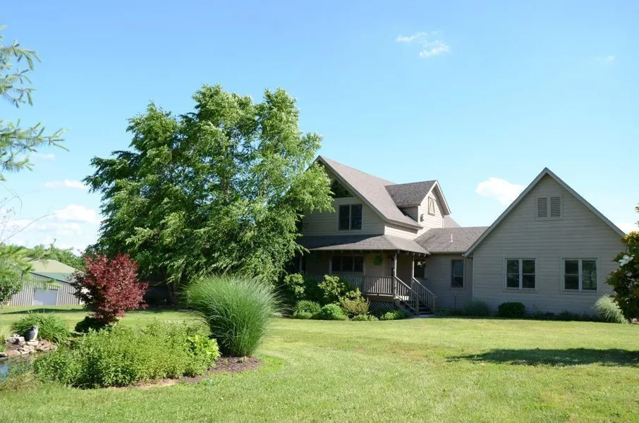 Wonderful Amish built Timber Frame home situated on beautifully landscaped 9.6 acres with numerous outbuildings and a guest house. Very open floor plan with soaring ceilings, kitchen, living and dining all open to each other. Kitchen has pine flooring, pickled oak cabinets with slide out drawers and shelves, island with Jenn-Air, Advantium oven, Whirlpool dishwasher and refrigerator stays. Special features include 3 stone fireplaces, enclosed patio, oversized 3 car garage, beam construction with wood peg joints, huge deck, and cedar siding. The guest house has a bedroom, bath, laundry area and kitchen with stove and refrigerator. The outbuildings are a 30x40 pole barn, and a 50x48 building with electricity. Also has large front porch, large deck in back and a water feature in the yard.