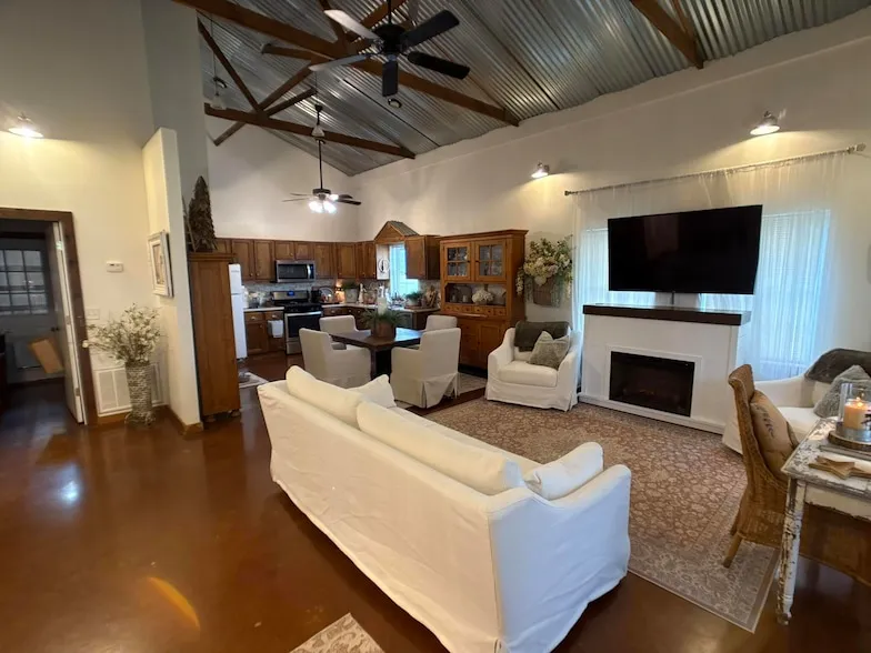 Charming barndominium featuring 2 bedrooms, 1 bathroom, central heat and air, stylish stained concrete floors, a dedicated laundry room, and a fully equipped kitchen. Abundant windows and soaring ceilings create a bright, open feel, making the space feel larger than it is. Step into the shop and you will see a full wall of shelves for storage. The shop door is 11'6''x11'6'' so you can park several vehicles inside or park your RV. This is a must see and with 7+ acres of land you don't have neighbors that are too close. Come see it for yourself!
