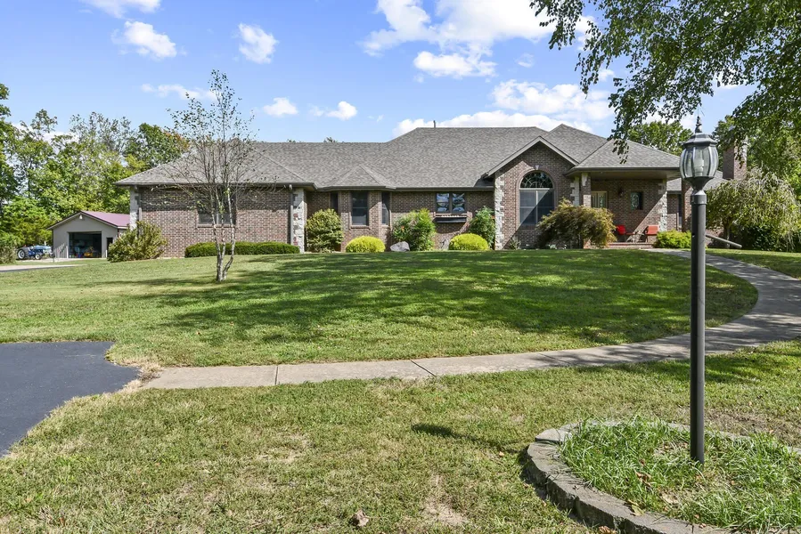 Find your next home in this lovely secluded all brick house on ten acres just minutes from town. Drive into a parklike setting of majestic trees, open fields, privacy and quiet. The kitchen is a lighthouse of warmth with a wealth of convenient roll out shelves and plenty of counter top on island and over bar area. The large Living Room has beautiful crafted ash wainscoting, crown molding, wall to wall windows with a see through gas fireplace to the hearth Room. From there doors open to a large covered porch. The primary bath and bedroom has French Doors to a covered deck with a panaromic view of the propery. The first floor also has another full bath and bedroom. Leaving the wood covered floor of the dining room and foyer, go downstairs to a great room with wood burning stove in fireplace, kitchen with double sink, dishwasher, stove, fridge and ample dining area. There are three more large bedrooms and tons of closets and a full bathroom plus an extra large room for play, crafts, storage, etc. All is easily accessed by a driveway to the large patio and walk-out doors. Not only does the house have a three car attached garage but a 30x40' concrete floor building. Add your loved ones to call it