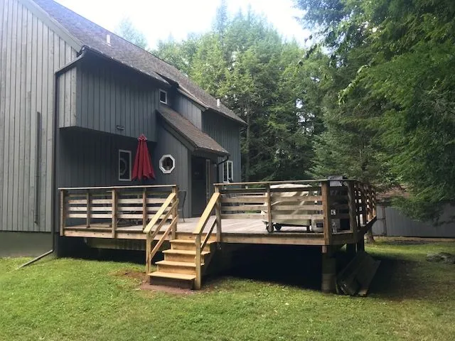 Cool Catskill Contemporary on 5 private acres tucked into the evergreens it is in excellent condition and central to the town of Windham and area attractions. Recently renovated featuring unique farmhouse accents that contrast the modern architecture beautifully. New hardwood and slate flooring, white kitchen cabinetry, butcher block counters, classic farm style sink and large country table opens to cozy sunken living room with woodstove. Natural light streams through the huge sky lights, two sets of glass sliding doors open to wrap around deck Main floor bedroom also has access to deck, upper level has two large bedrooms one with private balcony and full bath. Basement is approx. 900 sq. ft. waiting to be finished -there are two large windows and woodstove to help get you started. Open lawn is screened by tall pine trees -no neighbors in sight! New garage stores ATV and outdoor gear, enlarged back deck serves as the hub for outdoor BBQ's and chilling around the firepit. Sweet!
