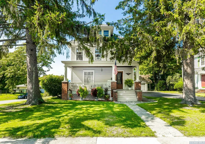 Built in the 1920's and boasting many original details throughout, this American Foursquare is the quintessential Catskill Village home. As you grace the front steps of 77 Woodland Ave, you will notice a wide front staircase that leads to the expansive front porch, perfect for enjoying your favorite book, beverage, or visits from friends. Inside, you will be greeted with a beautiful mission-style staircase, open living/dining room with built-ins and a pull-down writer's desk. Towards the back of the home, you will find a wood-lined 3 seasons room with a wall of windows that provides the perfect views of the backyard with a seasonal Catskill Mountain backdrop. The eat-in kitchen has updated stainless steel appliances and a light, airy feel. Head upstairs to find 3 bedrooms, laundry room and full bath along with a walk-up attic. Perfectly placed on a corner lot, 77 Woodland Ave provides just the right amount of yard for entertaining, gardening and lounging. A detached two-car garage and wide driveway allows for ample off-street parking. Located just a few blocks from the Thomas Cole House, Beattie Powers Place, Rip Van Winkle Bridge's Artist Walk and Village of Catskill's Historic Main Street. Head a mile or two away to the parks at the Hudson River and Catskill Creek. It's time to come to Catskill and call 77 Woodland Ave your Home!