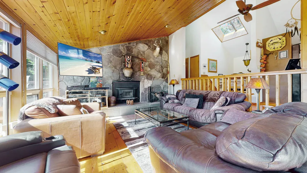 Views views views.... enjoy year-round 180-degree views of Hunter Mountain slopes, Fire tower and Rusk and Plateau Mountain ranges from nearly every room in this beautiful 4-bedroom cedar contemporary. Prime location within Hunter NY's premier development, Lookout Mountain Estates, this home is perfectly positioned privately tucked away at the end of the cul de sac perched up on the hillside ensures the unobstructed aspirational south facing views will remain. Sunlit open floor plan boasts vaulted ceilings with wall of windows that showcase the spectacular panoramic views, wide plank pine flooring and hardwood floors are accented with tongue and groove wood ceilings and walls throughout, primary bedroom features renovated bath with walk in tile shower, glass slider leads to private balcony (ready for hot tub), kitchen has a great flow with large center island and separate dining area that can easily seat many guests comfortably. Step down into the living room warm up next to the bluestone fireplace with raised hearth, glass door leads to massive two-tiered deck, lovely setting to host outdoor dinner parties or relax and watch the seasons change. The first floor has 9-foot ceilings with large windows that fill the family room and guest bedroom with natural light. Rejuvenate in the sauna and jacuzzi bath after a day on the slopes. Attached heated garage features abundant shelving, next door is an enormous workshop with vaulted ceilings and storage loft, plus baby barn provides plenty of dry storage and space to create or tinker. Landscaped yard with mature plantings features a stone patio with firepit and water garden. Convenient to many area attractions and just across the street you can walk the footpath right into the village- a nice balance of views, privacy with proximity- a rare combination!