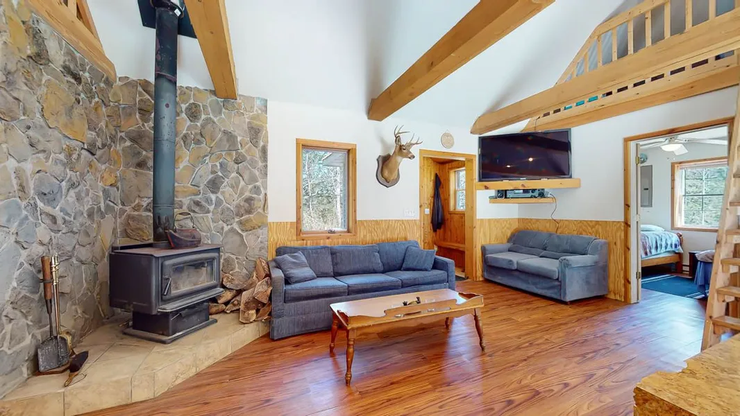 Affordable and adorable- all the elements you need for a relaxing vacation home in the country is here! This private and charming retreat is in very good condition, featuring a sun filled cozy open concept floor plan with vaulted beamed ceilings and woodburning woodstove that will keep you nice and toasty on chilly days. 2 bedrooms plus sleeping loft spaces can accommodate 5-7 people comfortably. Sliding glass doors lead to a spacious deck with room for hosting outdoor BBQ's, fireside chats and lounging in the sunshine overlooking the backyard's natural landscape of evergreen woods, indigenous moss-covered ledge rock and seasonal stream that runs through the property, such a magical setting! A natural spring provides delicious drinking water, it's so good you'll want to bottle it and take it home with you. Large shed offers plenty of dry storage for tools and toys. Not much to do to mak...