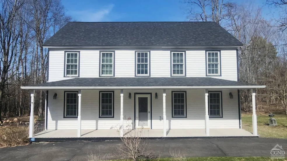 Stunning 1860's Center Hall Colonial in the heart of East Durham on 3.7 acres. Tastefully renovated (in 2000) 1976 sq ft home maintains original character. Renovations include: new sheetrock; upgraded electric, plumbing and septic; central air on first floor; and more! Wide plank wood flooring throughout. First floor has: kitchen; combined living room and dining area with plenty of windows for natural light; large primary bedroom with ensuite full bathroom; and a half bath in the central hallway. Sliding glass door access from the kitchen to the large back deck is convenient for entertaining. Kitchen has plenty of cabinet space, a propane fireplace for warmth, and a washer dryer for convenience. Propane fireplace adds warmth to the living room and dining area. Second floor boasts 4 large bedrooms, one with an electric fireplace and a large full bathroom with a separate hot water heater. Garage holds 3 cars, plus has solar panels on the roof and is approximately 15 years old. The shingle roof (house) and the 30 gallon hot water heater were replaced in 2024. This property is tucked away on a country road, while offering walking distance to pubs, dining, festivals and more. Close to shopping, Zoom Flume, hiking, NYS Thruway, and only 17 minutes from Windham Mountain.