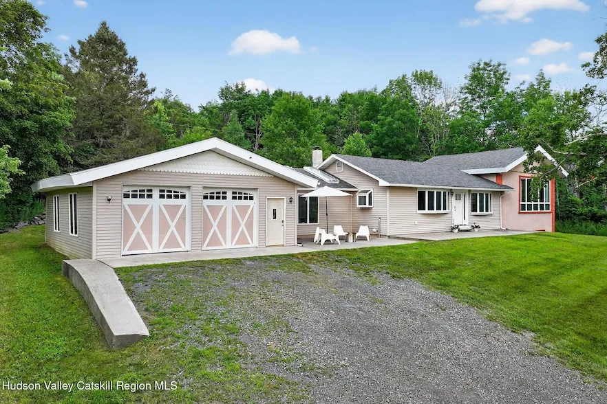 Nestled just 2.9 miles away from the breathtaking slopes of Windham Mountain and across the street from 89 acres of protected land sits this stunning 3 bed, 2.5 bath ranch. The home offers a captivating blend of modern touches and natural beauty. As you step into this picturesque retreat, panoramic views of the surrounding landscape greet you from every window, with the Windham slopes on display from the comfort of your living room. The heart of this home is a spacious, open layout designed for both relaxation and entertainment. The main level boasts a thoughtfully arranged split floor plan. The expansive living room, with French doors, opens up to a deck overlooking a backyard oasis, perfect for smore's and star gazing. Imagine waking up in the master suite to start your day. The suite is complemented by a renovated master bath, offering a spa-like experience right at home. The kitchen is a cook's dream, featuring sleek new countertops, a stylish backsplash, refreshed cabinets and updated refrigerator and dishwasher, all waiting to inspire your culinary creativity. Downstairs, the basement unfolds into a versatile space featuring a sprawling family room, game area, media space, complete with patio access, this area is perfect for entertainment. The lower level also features a half bath and laundry and utility room. For those who appreciate convenience, an attached four-car garage, along with two driveways, ensures ample parking space for family and guests alike. Recent updates add to the home's allure, including a new roof and parged chimney, a comprehensive 4-zone split system HVAC for tailored comfort, a cozy propane fireplace for chilly evenings, renovated bathrooms, updated kitchen, and enhanced home drainage systems. The new front door adds a welcoming touch to this already inviting home. This home is a rare find for anyone seeking a harmonious blend of style and proximity to outdoor adventures. Don't miss the opportunity to own a slice of Windham Mountain living, where every day feels like a retreat.