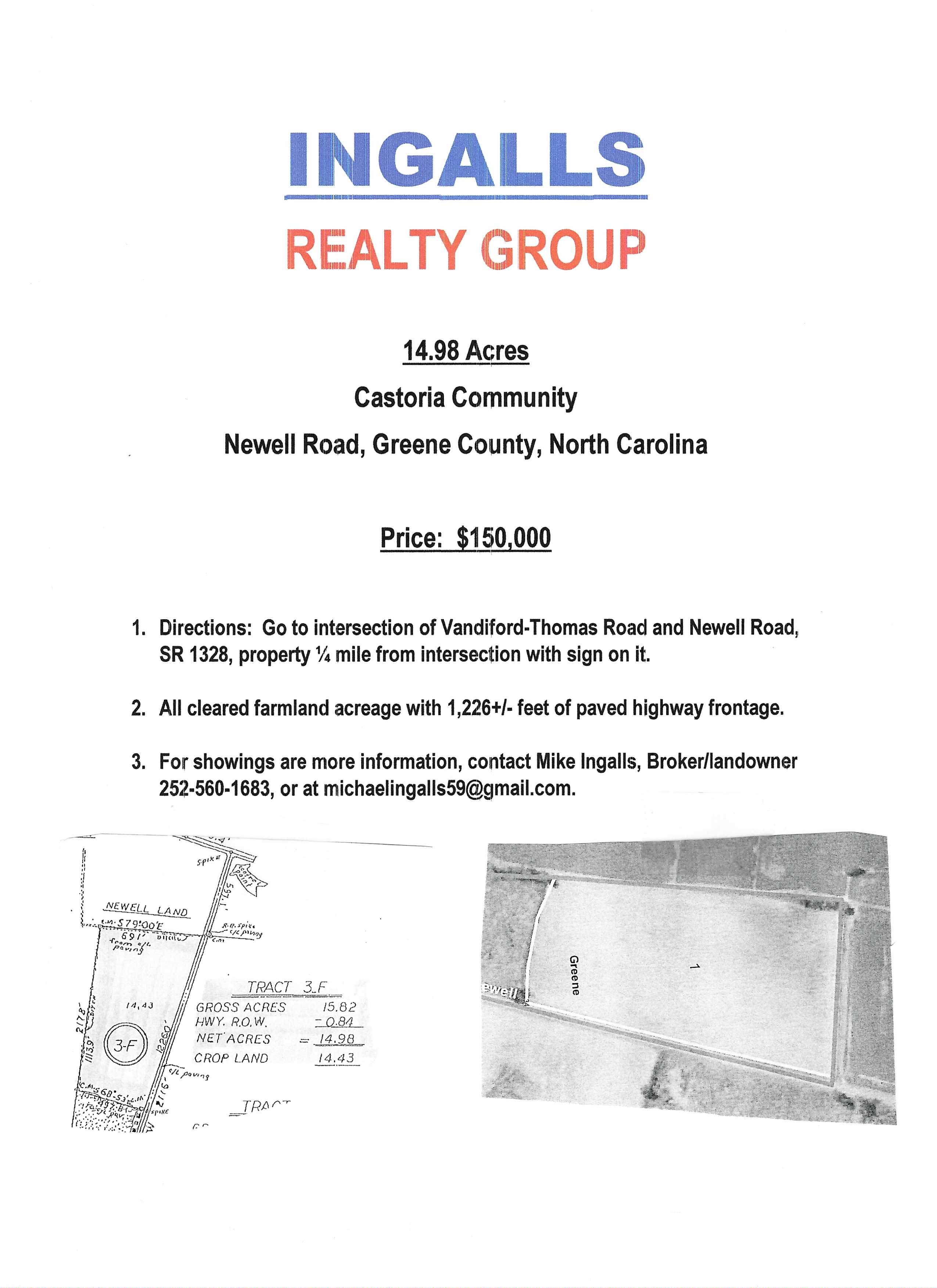 14.98 Acres of all cleared farmland with 1,226+/- feet of highway frontage on Newell Road in the Castoria community. Great tract for a mini farm, horse farm or for residential development. Located within a 30 minute drive of Greenville, Goldsboro, Kinston and Wilson, NC. Located only 5 minutes from Greene Central High School and Lenoir Community College Greene County Campus in Snow Hill, NC. Property is broker owned. Excellent tract to build your home on with additional road frontage to build for family or friends.