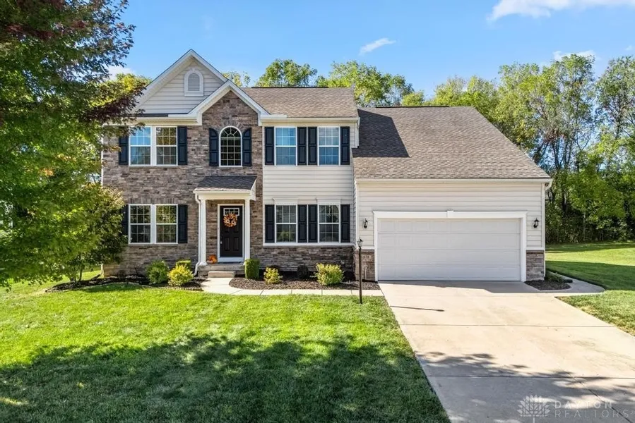 Beautifully maintained two-story home, offering an abundance of living space. Notice the meticulous attention to detail throughout. The main floor welcomes you with a spacious dining room, featuring hardwood floors, a versatile flex room sits nearby, offering a space that can be adapted to your needs whether as a home office, playroom, or quiet reading nook. The great room is a showstopper, highlighted by a striking stone gas fireplace. The large kitchen is a chef's dream, equipped with a spacious island, gas range, granite countertops, and a walk-in pantry. The adjoining breakfast room is bright and airy, with french door access to the backyard deck, perfect for gatherings or quiet mornings outdoors. The main floor also features a study, ideal for focused work, and a convenient half bath. Upstairs, four generously sized bedrooms, each bathed in natural light and offering ample closet space. The master suite is an oasis, offering a huge retreat with a dual sink vanity, a walk-in closet, a jetted tub, and a separate walk-in shower. The second floor is complete with a full bathroom and a dedicated laundry area, adding convenience to your daily routine. The finished basement extends your living space even further, offering a large rec room that can be customized for entertainment, games, or activities. A full bathroom is located on this level, ideal for guests. Additionally, there’s plenty of storage space, and a room with an egress window that can easily be transformed into an additional bedroom. All appliances, including the washer and dryer convey and an invisible dog fence with collar is included for your furry friends. The tree-lined backyard provides privacy and a peaceful atmosphere, making it the perfect spot for outdoor enjoyment. Fantastic location! Minutes from WPAFB, shopping & restaurants