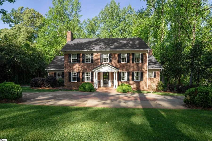 Welcome to southern charm with this gorgeous 1.1 acre grounds in the heart of Parkins Mill. Perfectly situated away from the public road, this all brick home exudes tradition. Upon entering the circular drive, the covered front porch invites you into the home. When entering, enjoy the living room on left (currently used as dining room for large family gatherings) with wood burning fire place and ample room for furnishings or entertaining. Main hallway, w beautiful slate flooring leads you to sitting room off the kitchen with access to deck. Further down main hall is handsome den with gas fireplace and full bath with access to bedroom (used as sitting room). Second level has 4 large bedrooms. Primary has walk in closet, and additional closet, full bath with beautiful travertine tiled shower and granite countertops. Hall bath for 3 bedrooms on second level. 2 car garage is on back of home basement level. Two work closets, one currently used for wrapping, and the other for yard tools. The backyard is a DREAM. Rarely does an opportunity come available to have this lush green paradise this close to downtown Greenville, shops, and swamp rabbit trail. Complete with a gazebo in the back, feel as if you have walked back in time with the beautiful trees and green yard around. Come make this fabulous house your home.