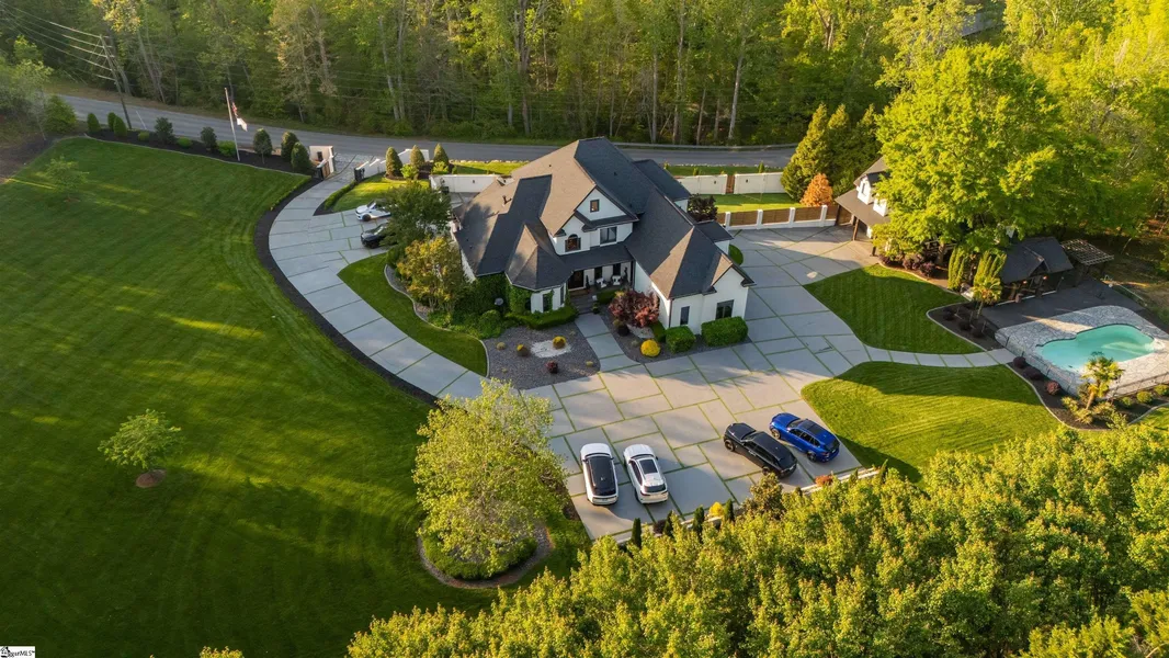 Discover an unparalleled sanctuary nestled on over three private, manicured acres in Simpsonville's sought-after executive suburban setting. Welcome to 1906 Jonesville Road, a 6,284 sq ft estate reborn through a meticulous, million-dollar-plus transformation, offering a lifestyle of sophisticated luxury and effortless entertaining. All without the conformities of an HOA, this estate provides room to roam and savor coveted peace and privacy—a true rarity. The main residence, completely reimagined, unfolds with gracious proportions and an on-trend Restoration Hardware vibe. Wood floors gleam on the main level, leading to the heart of the home: a show-stopping gourmet kitchen awaiting the most discerning chef. It boasts Wolf double ovens, a six-burner gas range, Subzero refrigeration, all integrated amidst solid 2-inch thick quartz countertops. An impressive Coppersmith hood presides over the range, while the large island with double sink, Cove dishwasher, and abundant storage ensures functionality matches form. A dedicated coffee bar completes this culinary masterpiece. Entertain in the dramatic two-story living room, anchored by a sophisticated quartz fireplace and illuminated by a breathtaking RH chandelier. The main-level primary suite is your personal sanctuary, featuring a modern Napoleon fireplace, cozy sitting area, and direct terrace access. The ensuite bath rivals a five-star spa, boasting dual vanities, Toto bidet, and an extraordinary app-controlled dual steam shower system. The crown jewel is the magnificent, boutique-style closet with an island and chandelier. Upstairs, discover three generously sized bedrooms, plus a large flex room with a newly added ensuite bath, offering flexibility. Descend to the terrace level, designed for ultimate recreation. A spectacular recreation room features a Nano wall that completely opens, blurring the lines between indoors and the incredible pool terrace. This level also hosts a private bedroom, full bath, spa room with infrared sauna, state-of-the-art theater, climate-controlled wine cellar, and convenient laundry. The pièce de résistance for entertainers is the newly added, fully equipped commercial kitchen and pool bar, seamlessly servicing poolside festivities with keg space and bar seating. Step outside onto the main pool terrace and immerse yourself in a "Miami vibe"—a world of pure modern relaxation perfect for weekend entertaining. This heated saltwater pool beckons, accented by deck jets and a unique sunken firepit in its midst, surrounded by lounge areas, dining space, and a chic cabana. Integrated sound systems and ambient modern wall uplighting set the mood. But the aquatic luxury doesn't end there. Discover a second, separate saltwater pool accompanied by a magnificent pavilion, complete with its own fireplace and a full outdoor kitchen—perfect for larger gatherings or perhaps a dedicated kids' zone while adults enjoy the main terrace. This property offers the unique ability to be a luxurious cocoon during the week and transform into the ultimate entertainer's destination on weekends. Beyond the main house, a detached two-car garage provides additional parking for vehicles or "toys" and houses a private one-bedroom, one-bath guest apartment above. Combined with the attached three-car garage and extensive motor court, the property offers exceptional parking capacity. Control4 home automation seamlessly integrates shades, lighting, audio, and TVs. A whole house water filtration system, tankless gas hot water heaters, and a property-wide camera system add security and wellbeing. Located in Simpsonville with easy access to Greenville and I-85. Experience the culmination of a million-dollar vision, where luxury and privacy converge in perfect harmony. This is not just a residence; it's a destination, meticulously crafted for those who seek the extraordinary.
