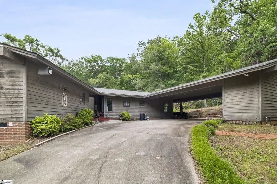 BACK ON THE MARKET THROUGH NO FAULT OF THE SELLER! Private retreat on 8 acres with NO HOA surrounded by woods, native shrubs and flowers, and all the best of mother nature. Feel the stress melt away as you make your way up the winding circular drive flanked on either side by tall trees and dappled sunlight. At the top of the hill sits the 2 bed/2 bath home with open concept living and dining area and an outdoor living space that feels like living in a treehouse. The vaulted living room boasts a stacked stone wood burning fireplace, wood beams, and a tongue and groove ceiling along with a wall of windows overlooking the wooded property. There is a spacious dining area with additional flex space that leads into the kitchen where you will find granite countertops, pantry closet, plenty of counter and cabinet space, pantry closet, built in display cabinet and breakfast area with another view of nature. There are two bedrooms arranged in a split floorplan. The first has access to a hall bath along with a private covered porch and private entry while the other bedroom features an en suite bath and walk in closet. Rounding out the inside of the home is a walk in laundry room. The outside living space is the star of this home! There is a huge wrap around multi-level deck, hot tub deck with four person hot tub, and large screened porch, all with endless views of the woods filled with azaleas, rhododendrons, mountain laurels and Japanese maples, just to name a few! The property itself boasts a detached workshop/storage building with electricity, an additional storage building, covered parking, a small patio area with a former koi pond, and endless opportunities to explore! Located less than 20 minutes from downtown Travelers Rest, Bald Rock, and Lake Robinson, and just 30 minutes from downtown Greenville and Caesars Head, there is no shortage of things to do! This property is a rare opportunity to own your very own private retreat!