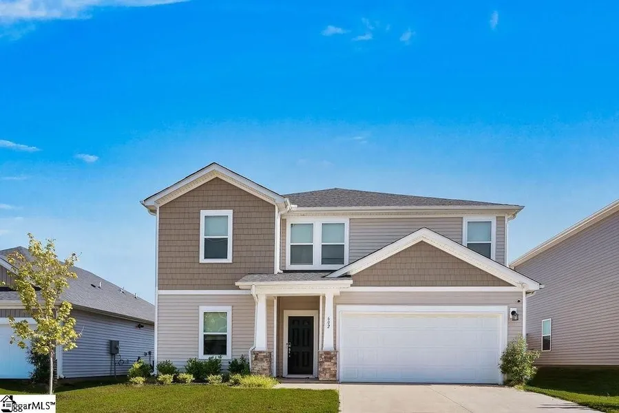 Welcome to 602 Splendid Place in the highly sought-after Garrison Grove community of Simpsonville! This stunning, nearly new 5-bedroom, 3-bath home blends modern style, energy efficiency, and everyday comfort. Step inside to an open-concept layout filled with natural light, luxury vinyl plank flooring, and a cozy gas fireplace. The designer kitchen features white shaker cabinets, quartz countertops, stainless steel appliances, and a large island perfect for gatherings. A main-level guest suite and flex room offer versatility for a home office, playroom, or formal dining. Upstairs, the primary suite feels like a retreat with a walk-in closet that connects to the laundry room, a spa-like bathroom with dual vanities, and a tiled shower. Three additional bedrooms, a full bath, and a spacious loft provide plenty of room to live and relax. Enjoy the energy-efficient upgrades like spray foam...
