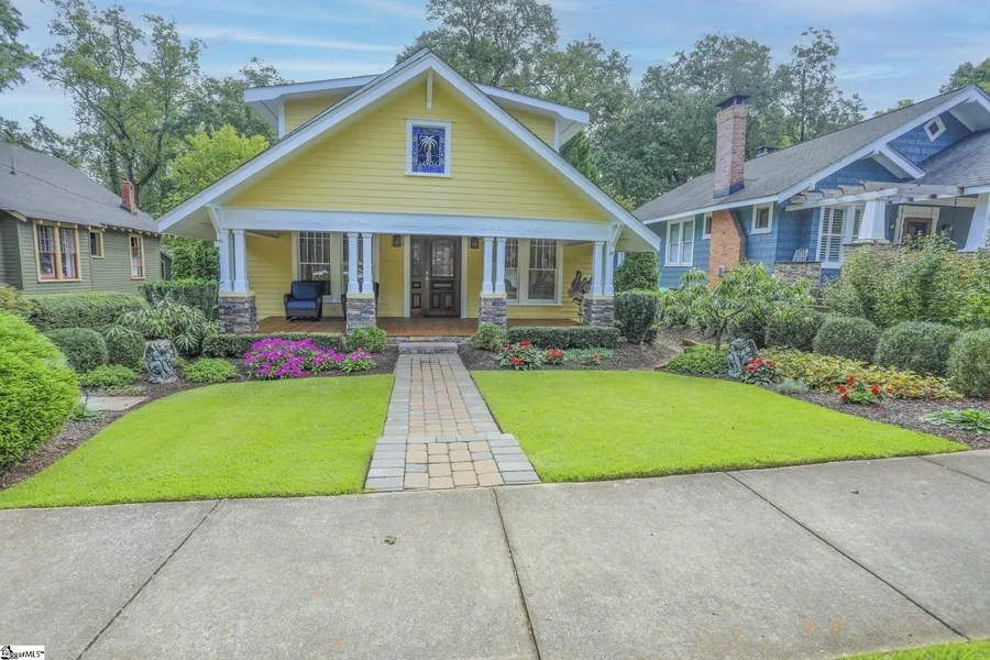 Exquisitely restored 30 Rowley Street, a 1950's Craftsman home situated just one block off Main Street in the highly sought-after East Park Historic District neighborhood, developed by Stone Land Co. This charming residence blends the unique personality and detailed craftsmanship of an older home with the benefits of modern updates, making it a superior choice for those looking for character and quality. The current owner has invested heart, research, and equity into rebuilding this property from the foundation to the new roof. Property Features - Hardwoods throughout; 4 Bedrooms 2.5 Baths (Primary suite downstairs, additional bedroom downstairs); Road Frontage: 54 feet. Orientation: West-facing with sunrise at the back and sunset in the front. Location: One block from Main Street Downtown Greenville. Main Level: The main level features a spacious Family Room complete with a gorgeous gas starter burning fireplace adorned with a hearty mantle and surrounded by Rosso Levanto marble. The chef’s dream kitchen is equipped with Santa Cecilla Gold Granite countertops, solid dovetailed Kraft Maid Mission Oak cabinetry in FNO-Fawn finish, and GE Profile stainless steel appliances, including an oversized refrigerator (with new ice maker), and a 5-burner gas cooktop with convection oven slide in range, dishwasher. French doors open to a deck stained with mahogany idea for outdoor extended dining, overlooking the meticulously landscaped, tiered backyard. The lower yard boasts a fire pit ideal for entertaining. The main floor also includes a large dining area, the primary bedroom with a generous en-suite bath, a secondary bedroom, and an oversized powder room/laundry area conveniently located off the kitchen, with ample space for side-by-side washer and dryer. Additional Features: Extensive 4-piece crown molding and 3-piece window molding; solid wood doors; Restored painted windows with original ropes and weights; Stained glass front door; front porch rebuilt with vaulted ceiling, cross beams; stained glass mural and #2 oak treated wood; Each bathroom in the home features customized cabinetry and handpicked granite surfaces; California style organizer in primary closet; upstairs bedrooms have walk-in closets; hardwoods and 2” wood faux blinds throughout home, two flexible spaces, one suitable for an office and another for guests, complete with built-in night lighting and a full bath. Upstairs, there are two additional bedrooms with walk-in closets, ensuring everyone has their own space. Powder Bathroom: Features pedestal sink and Empress Afyon Cloud marble floors; Primary Bath: Cape Brown granite, tile shower/jetted tub with accent pieces; Upstairs Bath: China Green granite, multicolored slate flooring continuing into the walk-in shower with frameless glass. See associated docs for additional documents for home systems & amenities. Outdoor Amenities - Paver driveway and sidewalk; Expansive deck for entertaining additional outdoor dining; Two-tiered landscaped backyard divided by a 5’ knee wall; Outdoor fire pit and meticulously landscaped lawn; Front lawn irrigation with capacity for six additional lines in the backyard. Neighborhood and Location - This home is ideally located within the East Park/Stone Land Co. Historic District, surrounded by beautiful historic homes and providing easy access to 385/123/Hwy 29. Residents enjoy a short walk to downtown McPherson Park, which features a mini-golf course, public pickleball courts, two playgrounds, all accessible by sidewalk from home. The Swamp Rabbit Trail is also nearby, offering additional outdoor activities. Everything you need is right at your doorstep, whether you prefer to walk or bike. The property is close to Greenville’s award-winning downtown district, boasting over 100 restaurants, the popular Liberty Bridge, shops, entertainment venues, and a performing arts center that hosts Broadway plays, symphony performances, and concerts, not to mention stellar school systems!