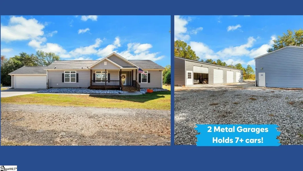 Sought after Blue Ridge 2.27 acres located in the MOUNTAIN VIEW ELEMENTARY School District! Gorgeous 1 level home built in 2018 offers over 1900 sq ft, above ground pool with big deck and 2 METAL GARAGES THAT WILL HOLD 7+ VEHICLES IN ADDITION TO THE 2-CAR ATTACHED GARAGE! This is NOT YOUR ORDINARY PROPERTY and is perfect for any CAR ENTHUSIAST or your own work from home shop! The home offers a large open floor plan that makes entertaining easy. The living room features COFFERED CEILING and a STONE WOODBURNING FIREPLACE. The kitchen boasts large FARM SINK, COFFERED CEILING, STONE & ARCHWAY surrounding the range, and large WORK ISLAND & BREAKFAST BAR. The primary bedroom boasts BARN DOORS, DUAL VANITIES, GARDEN TUB, SEPARATE SHOWER and a huge walk-in closet with CUSTOM BUILT IN CABINETS. Large deck surrounding the above ground pool and overlooks the firepit. The 2 buildings consist of: 30x60 building, 4 bays with 10x10 rollup doors and one bay is divided. The second building is 30x40, 3 bays with 10x10 doors and offers water and power. Car lift, air compressor, washer & dryer, furnishings in house are negotiable. Call 864-895-9791 for your private tour.