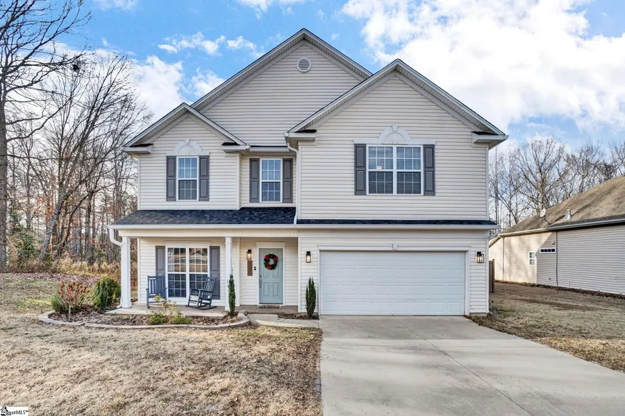 Welcome home to 124 Garfield, a beautifully updated, move-in ready family home in the heart of Simpsonville. Nestled in the sought-after Bryson/Hillcrest school district, this stunning traditional-style home offers exceptional privacy with community green space behind and beside the property - an uncommon luxury at this price point. From the moment you arrive, the charming curb appeal sets the tone with a manicured front yard, updated exterior lighting, and an inviting front porch. Step inside to a light, airy color palette and thoughtful upgrades throughout. No detail has been overlooked, with luxury vinyl plank flooring throughout the entire home (no carpet in sight!), all new light fixtures, custom closets, and beautifully updated bathrooms. Just off the entry, the formal dining room features a tray ceiling and flows seamlessly into the kitchen. The well-appointed kitchen boasts ample cabinetry and counter space, granite countertops, stainless steel appliances, and a stylish tile backsplash. The kitchen opens to the breakfast nook and spacious living room, highlighted by a cozy gas-log fireplace and an abundance of natural light. A flex space off the living room is the perfect space for a home office, playroom, or game room. Rounding out the first floor, you'll find a powder room and the entrance to your two-car garage. Upstairs, you’ll find four generously sized bedrooms and two full bathrooms, including your primary suite. The primary suite checks all of the boxes with a spacious layout, a tiled bathroom with updated vanities and fixtures, a soaking tub, walk-in shower, and an incredible custom walk-in closet. The backyard is truly the icing on the cake. Enjoy outdoor living and entertaining on the expansive three-tiered deck with pergola, all within a fully fenced backyard backing up to peaceful woods. Such a private setting while still being minutes from shopping, restaurants, I-85, Heritage Park and more! Bryson Meadows residents enjoy a friendly community with sidewalk-lined streets and a community pool. This is one you don't want to miss!